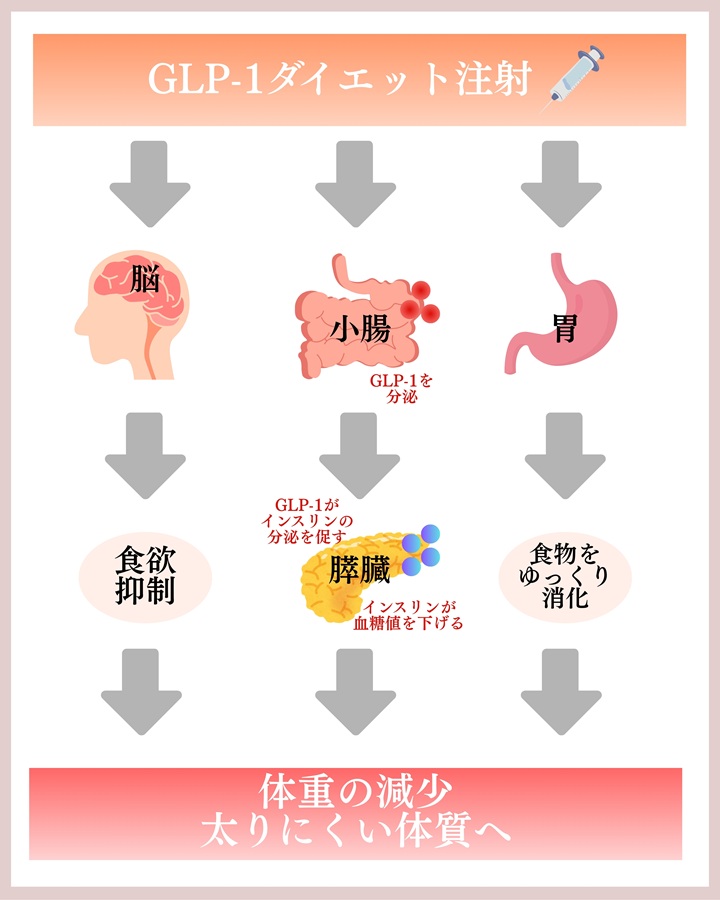 GLP-1は、食事をしたときに腸から分泌され、すい臓に働きかけてインスリンの分泌をサポートし、血糖値の上昇をゆるやかにする役割があります。