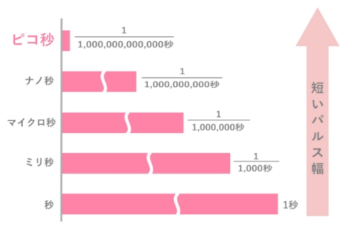 ピコ秒とは、レーザーが照射される時間の長さを示す単位で、1兆分の1秒という非常に短い時間です。