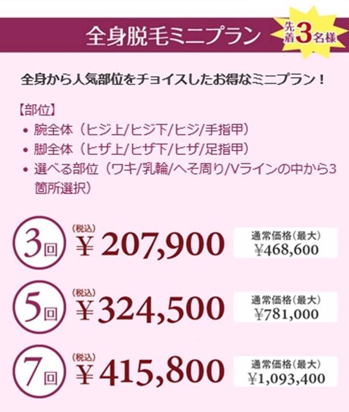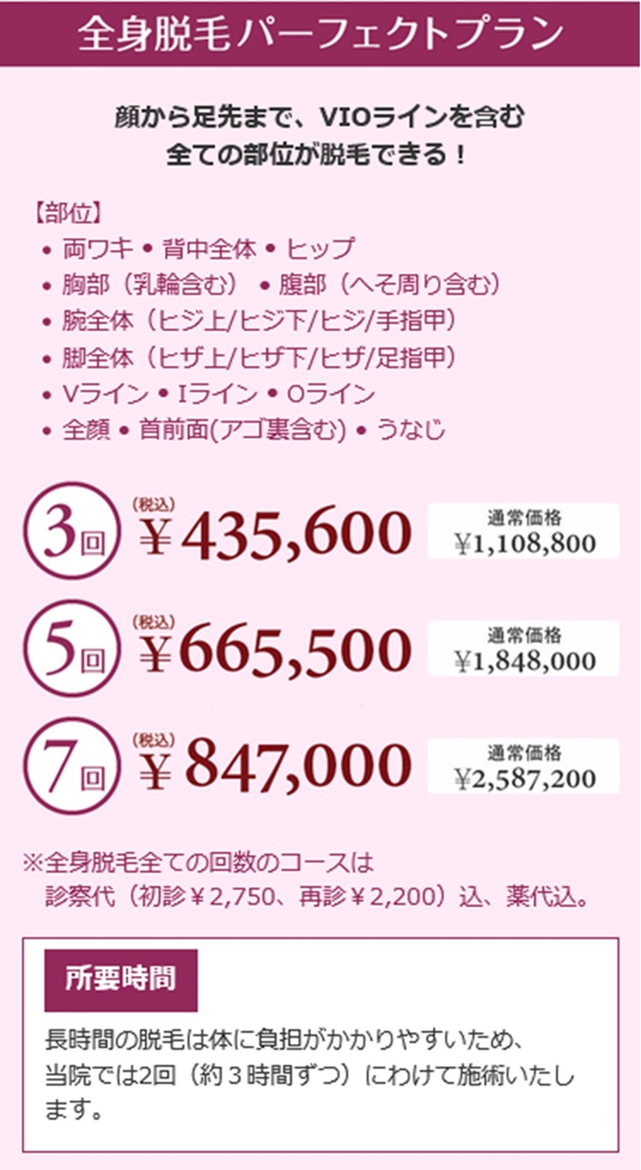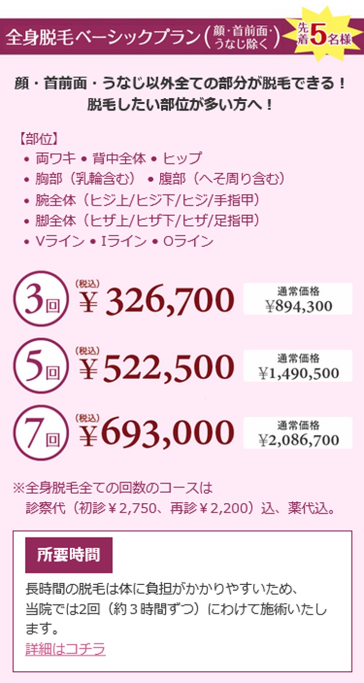 全身脱毛の所要時間は約6時間(個人差あり)で体に負担がかかるため、全身全部を1日で施術することはございません。上半身・下半身と分けて施術をしていきます。(約3時間目安)また、当院の予約状況・患者様のお時間のご都合により、部位ごとの施術やまとめての施術など、お時間を調整することも可能ですので、お気軽にお問い合わせください。