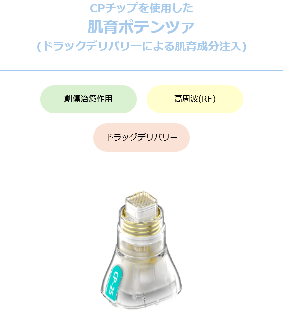 さらにCPチップには、針が抜けるのと同時に空気の力で皮膚に塗布された薬剤を注入する“ドラッグデリバリーシステム”が搭載されており、薬剤を均一、かつ正確に浸透させることができるため、ニードルRF治療と薬剤のコンビネーションによる相乗効果を得ることが可能です。