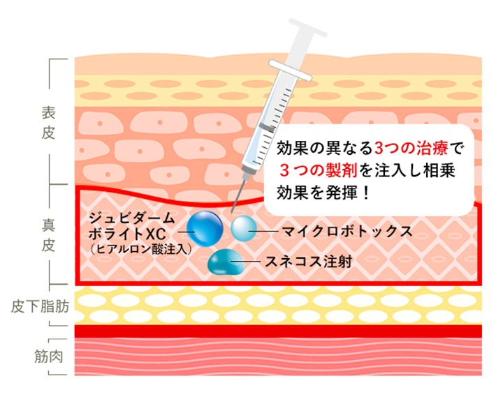 3種類の異なる製剤を、最適な層・最適な場所・最適な量で細かく注入します。